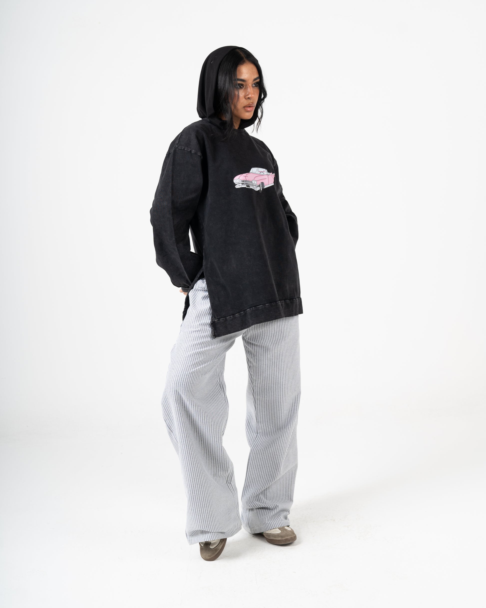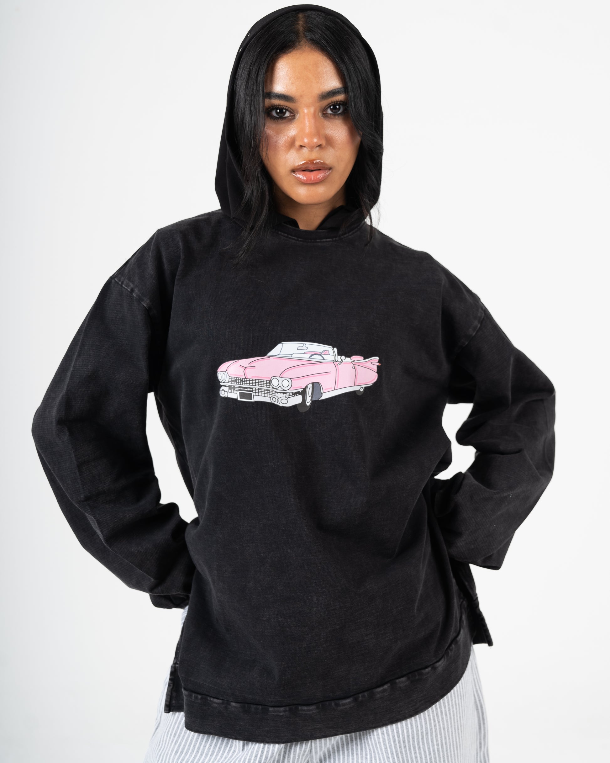 Turn heads with our retro-inspired long sleeve tee featuring a vibrant pink vintage car graphic on a faded black wash. Made from soft, breathable cotton, this relaxed-fit shirt is perfect for laid-back evenings or coastal strolls. The distressed look adds a touch of character, making each piece unique.
