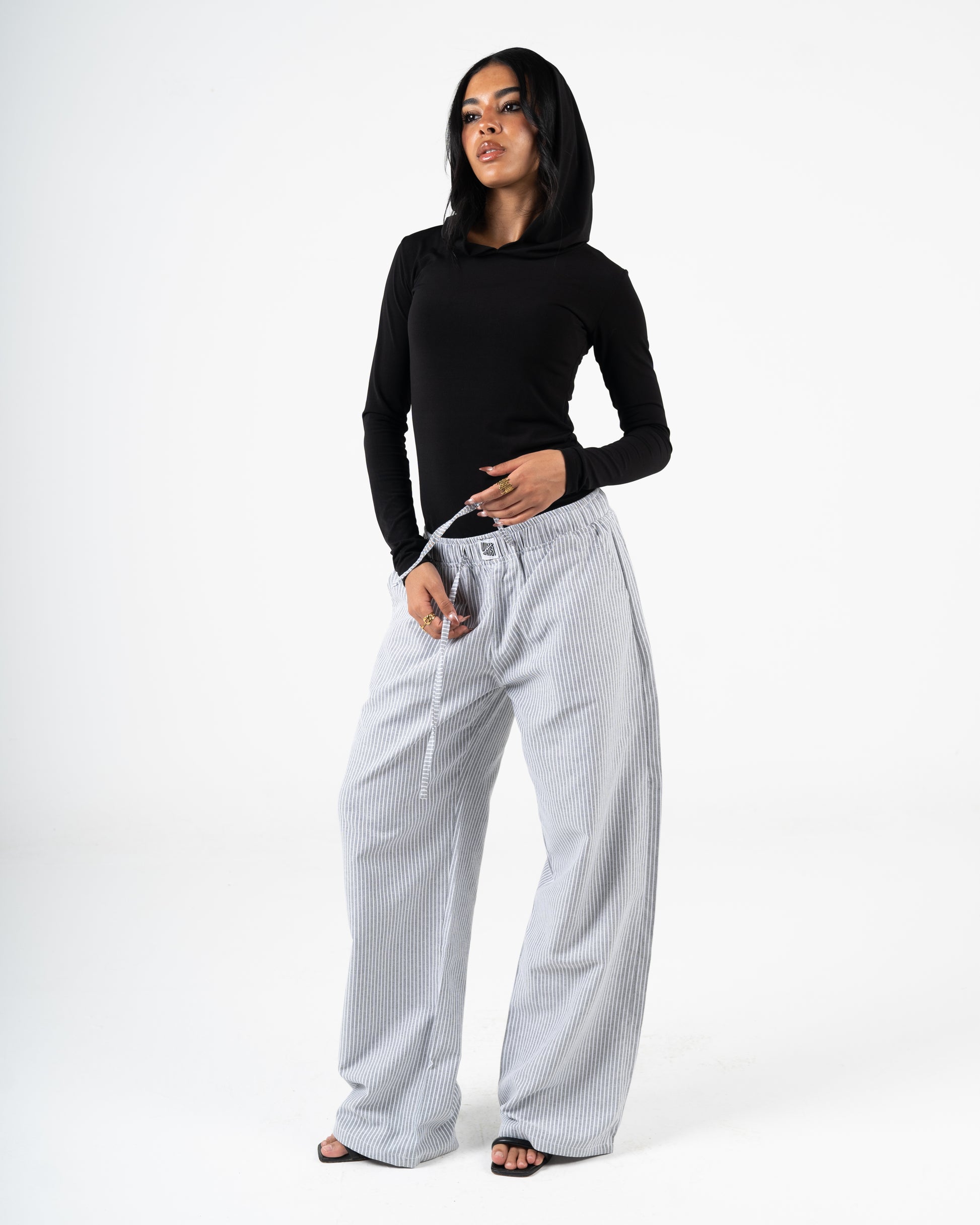 Design: Vertical pinstripes, elastic waistband with drawstring, two side pockets