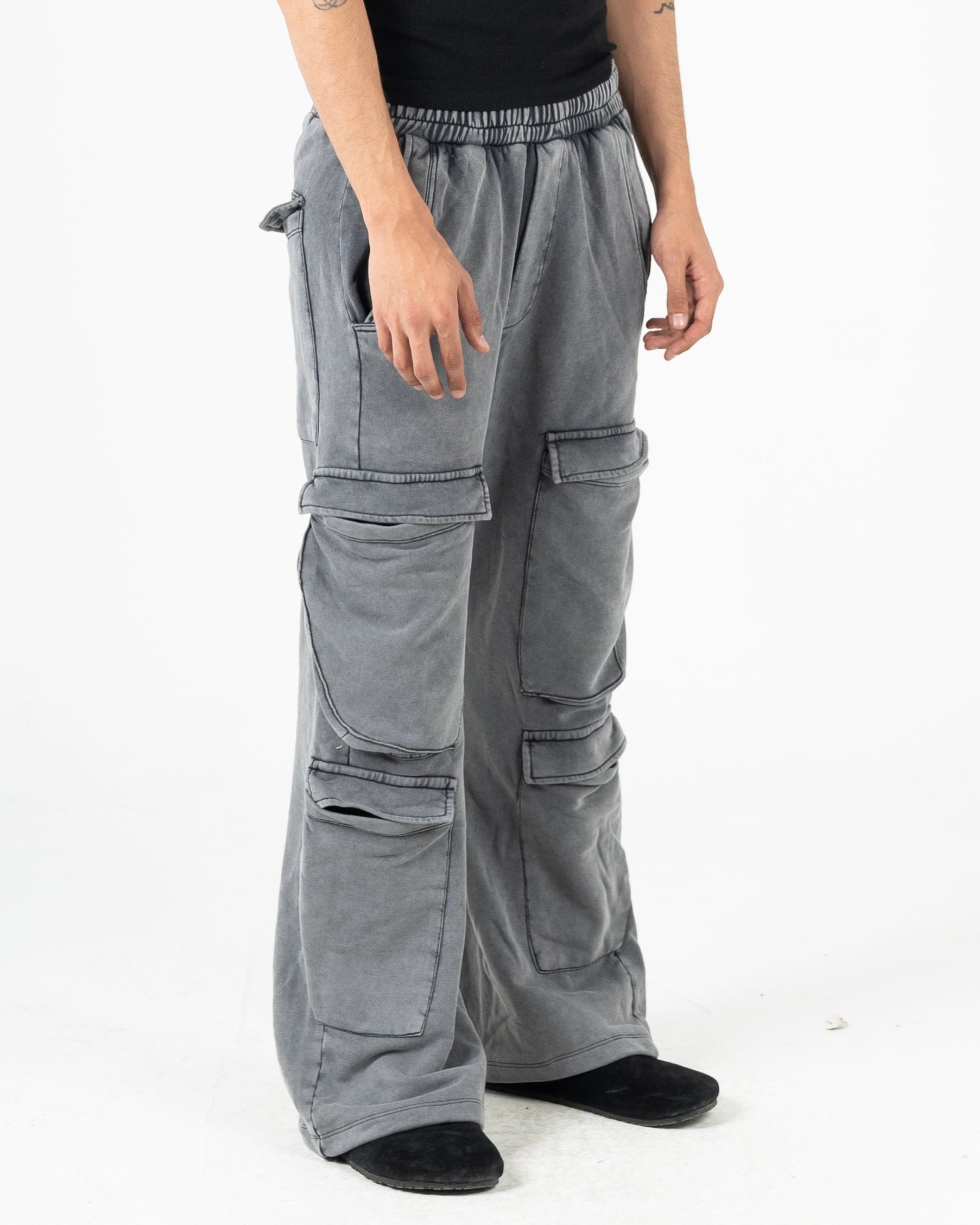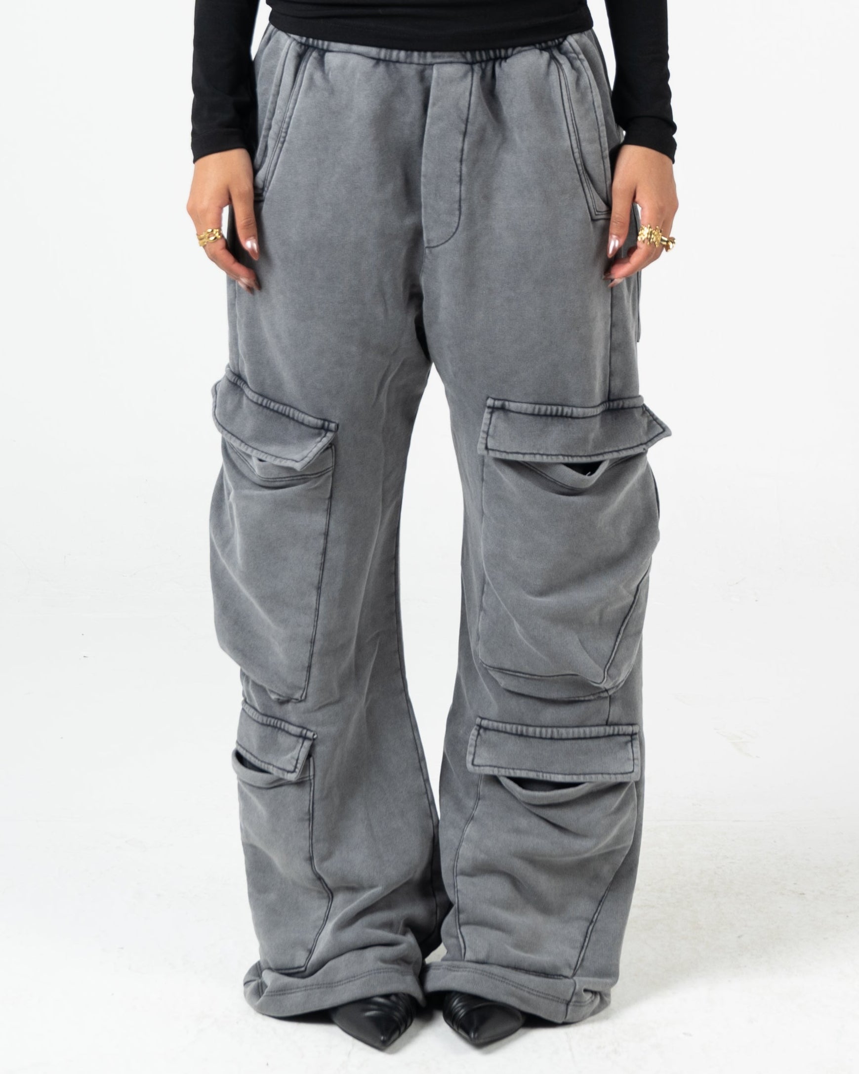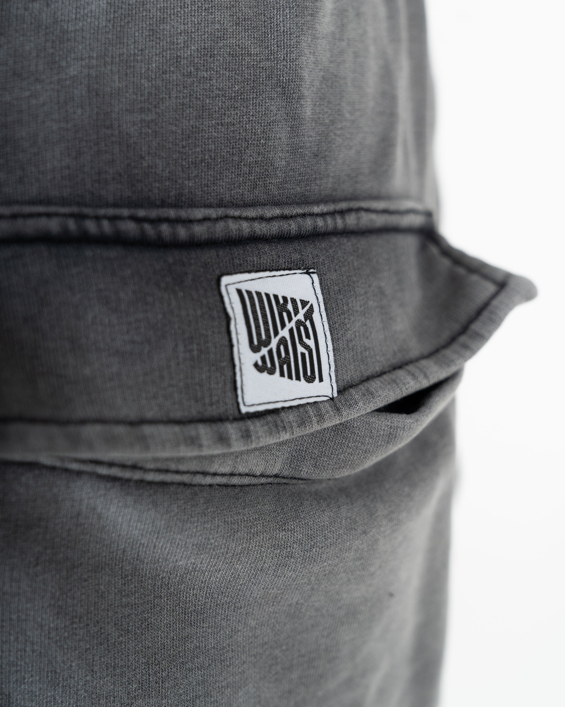 Design details: Washed effect, elastic waistband, cargo pockets, side pockets, straight legs